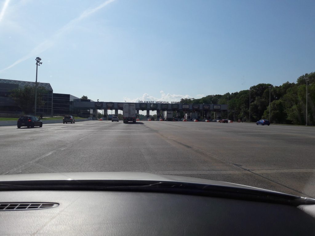 New Jersey. Jedziemy autostradą międzystanową (Interstate) nr 95. To szósta najdłuższa w Stanach. Olbrzymie podziękowania należą się Lindzie, naszej dobrodziejce, która pożyczyła nam na czas wyjazdu E-ZPass. Takie urządzenie montowane na przedniej szybie samochodu, które magicznie otwiera każdą płatną drogę 🙂 To po prostu elektroniczny system płatności za przejazd. Przy mijaniu punktu poboru opłat (zdjęcie wyżej), wjeżdża się na jeden ze specjalnie oznakowanych pasów ruchu, zwalnia się do 5 km/h i odpowiednia kwota zostaje zainkasowana z elektronicznej portmonetki. Można wtedy jedynie wyjrzeć przez okno i uśmiechnąć się do tych, którzy obok stają i płacą bardziej analogowo. I ciekawostka, autostrady w USA mają swoich sponsorów. Nie wiem na czym to polega, ale co jakiś czas są tabliczki, które o tym informują.