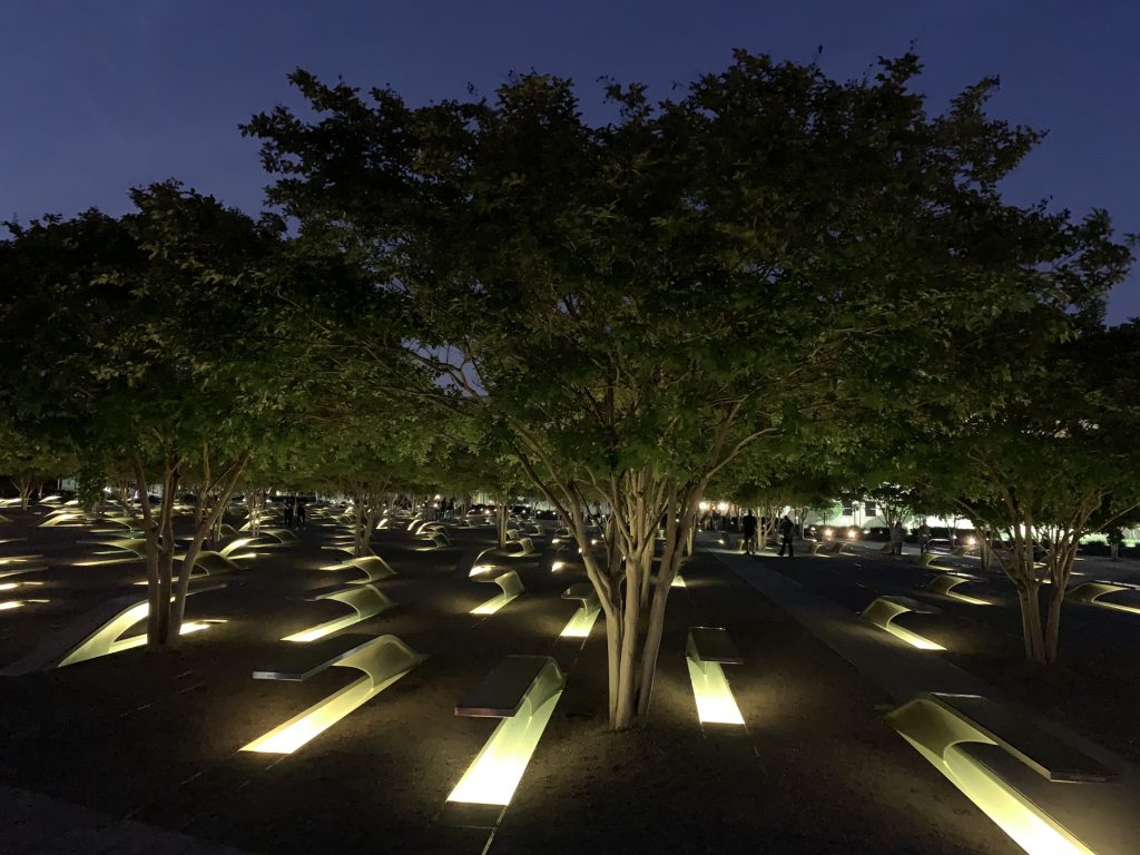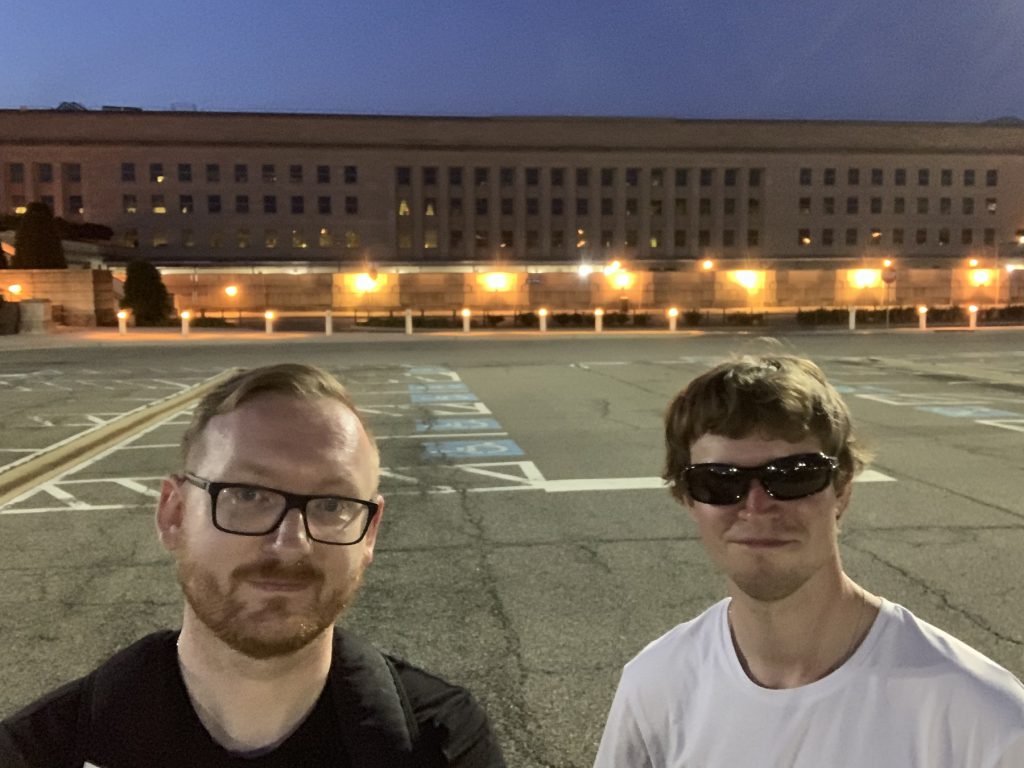 Sam Pentagon to w gruncie rzeczy nic specjalnego. Na wyobraźnię działa jedynie świadomość stania pod jednym z najważniejszych budynków w Stanach oraz historii, jaka się tu rozegrała 11 września 2001 roku. Wrażenie robi memorial tych wydarzeń, miejsce pamięci szczególnie wyglądało po zmroku. Niestety w pobliżu nie ma żadnego punktu widokowego, który oferowałoby taką perspektywę na gmach, żeby zobaczyć charakterystyczną, pięciokątną bryłę. Za ciekawostkę można natomiast podać, że (przynajmniej według Wikipedii) jest to największy pod względem kubatury i liczby pomieszczeń budynek biurowy na świecie, niebędący wieżowcem. Ponadto, mimo że ciągle jesteśmy w Waszyngtonie, jest to już teren stanu Virginia (granicą jest rzeka Potomak, którą mijaliśmy metrem). Ot, urok tego kraju i piąty stan tego dnia.
