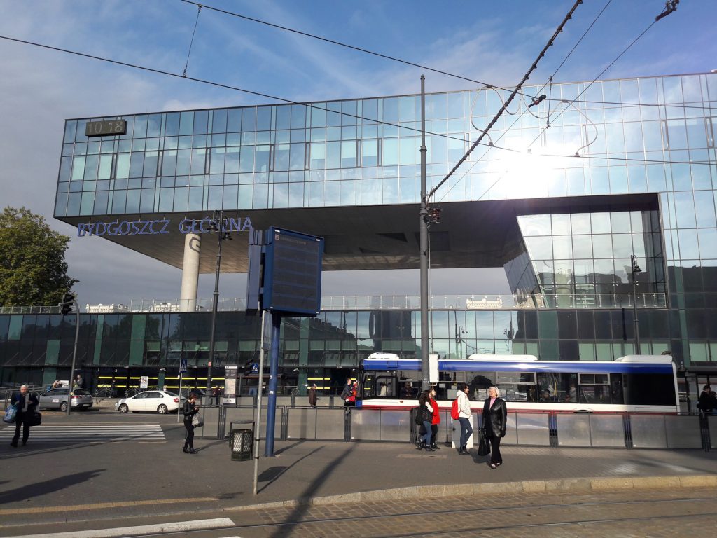 Wysiadam. Bydgoszcz Główna. Nie muszę daleko iść, już sam dworzec kolejowy jest interesujący. Frontem do miasta znajduje się nowy, szklany budynek o intrygującej bryle, po drugiej stronie torów jest natomiast zabytkowy dworzec. Co ciekawe, kolej niejako okrąża miasto, stacja nie jest w śródmieściu, a dworzec autobusowy zlokalizowano w zupełnie innym miejscu, w centrum. Sytuacja zupełnie jak w Lublinie (ale do czasu…).