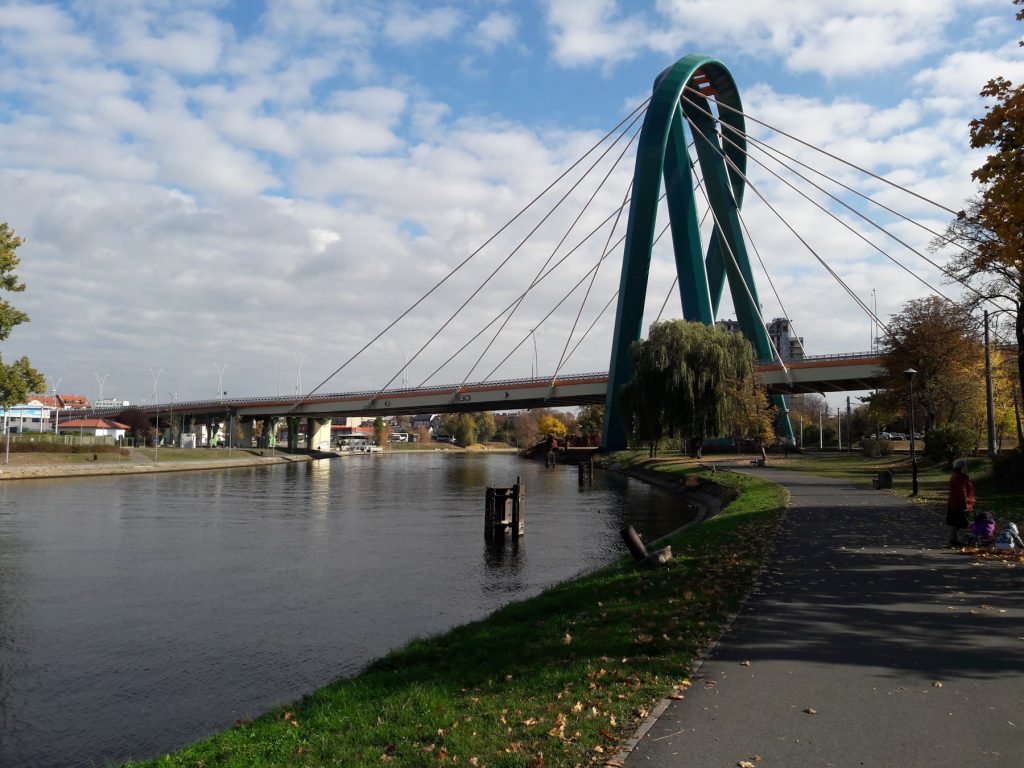 Hahaha, miałem przestać o tramwajach. Już. Oglądam się za siebie, a tam most. Słynna Trasa Uniwersytecka, o której było głośno w całej Polsce, bo przeprawa przez Brdę zaprojektowana została wyłącznie dla samochodów i zabrakło jakiegokolwiek chodnika, nie wspominając już o drodze dla rowerów. Natomiast same pylony wyglądają efektownie.